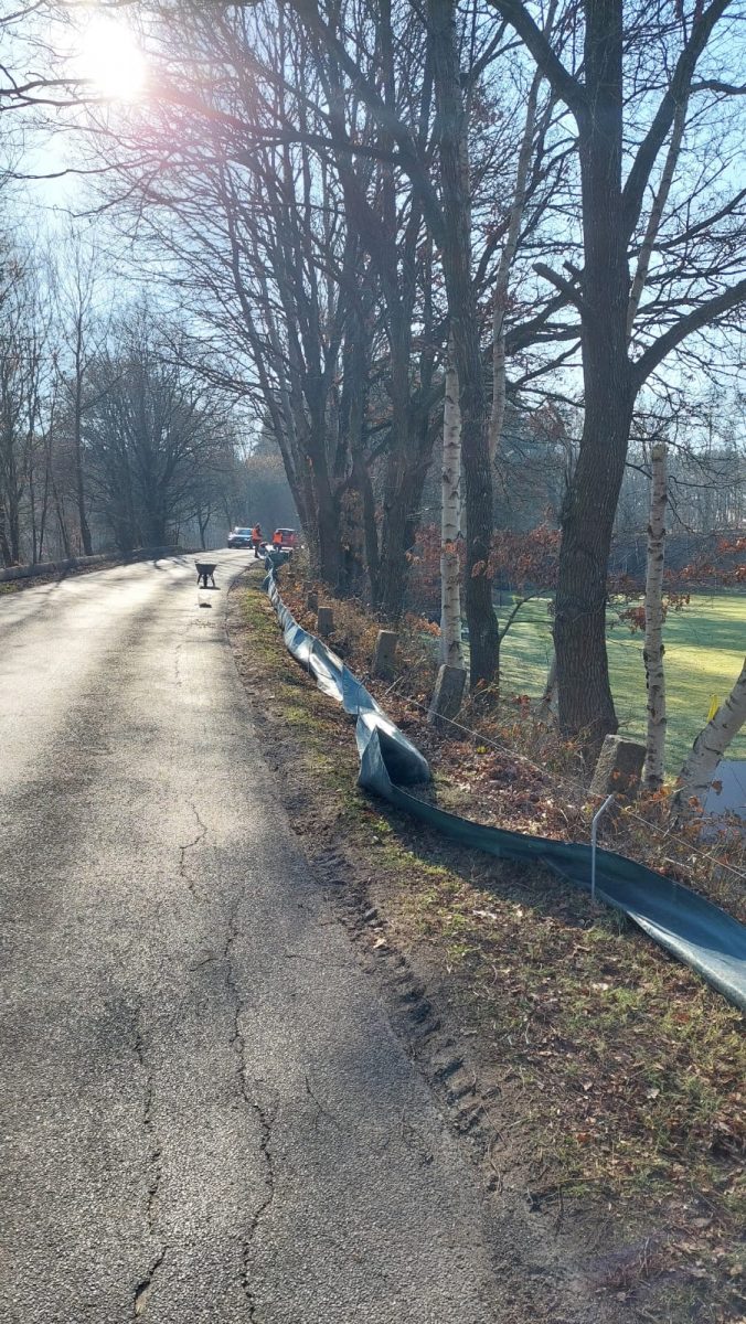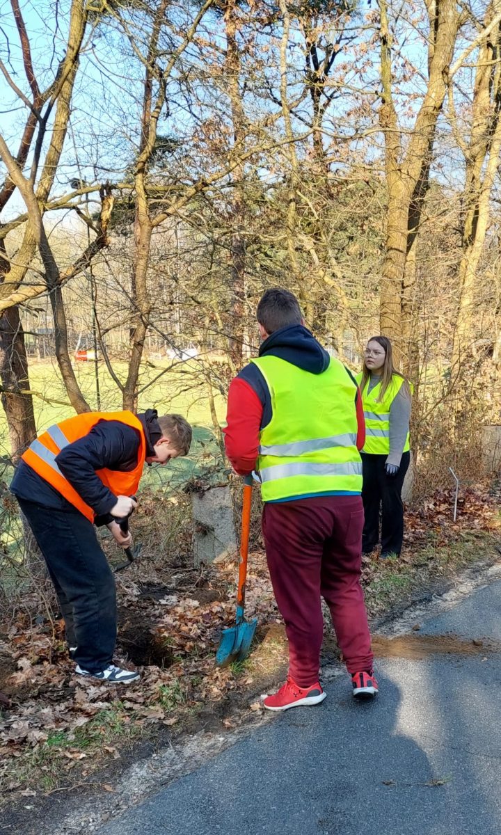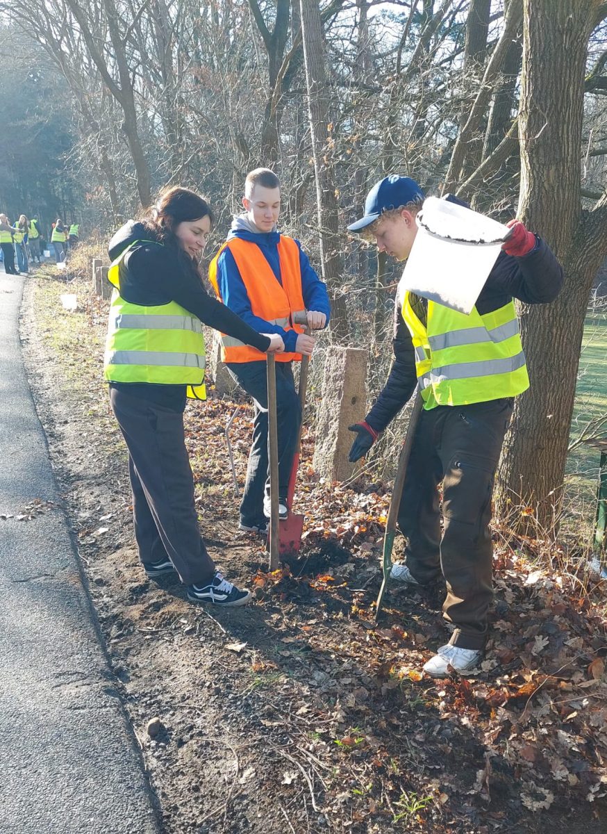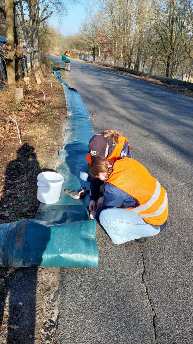 Bis zu 100 Kröten wurden pro Nacht auf der Straße Papenknüll überfahren, wo die Tiere auf dem Weg zum Ablaichen im benachbarten See die Straße überqueren. Dies berichtete eine Anwohnerin. Über den Kreisnaturschutzbeauftragten Jonny Waller kam die ökologische SOS – Anfrage so zu unserer Schule und traf mit dem WPU II Wald auf die nötige Unterstützung, um einen rettenden Amphibienzaun zu bauen. Am Donnerstag wurden 250 Meter Zaun installiert, der es ermöglicht, die Kröten vor dem Überqueren der Straße in einem der 15 eingegrabenen Eimern zu sammeln und dann einmal täglich zu ihrem Zielgebiet zu bringen. Bereits kurz nach dem Verbauen der ersten Meter konnten so mehrere Tiere gerettet werden.