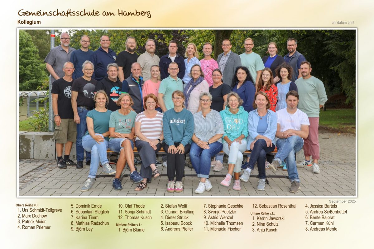 Derzeit werden unsere Schülerinnen und Schüler von 26 Kollegen/-innen aus den unterschiedlichen Schulformen unterrichtet. Auf dem Kollegiumsfoto sind außerdem unser Hausmeister Herr Kusch (Herr Struck fehlt), unsere Sektretärinnen Frau Sießenbüttel und Frau Peetzke, unser Küchenteam mit Frau Kusch und Frau Bajorat (Frau Wenzel fehlt) und unser IT-Experte Herr Diefholtz zu sehen. Es fehlen unsere Förderschullehrkräfte Herr Huuk und Frau Radschun sowie unser Schulsozialarbeiter Herr Pfeifer.
